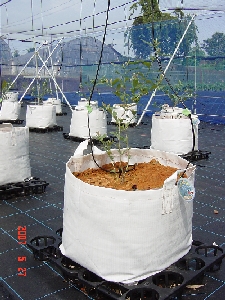 村上ブルーベリーガーデンでは、上記栽培適地を満足させるため「バッグ カルチャー システム」と言われる栽培システムでブルーベリーに最適な環境を作り、優れた果実の生産を行っている。