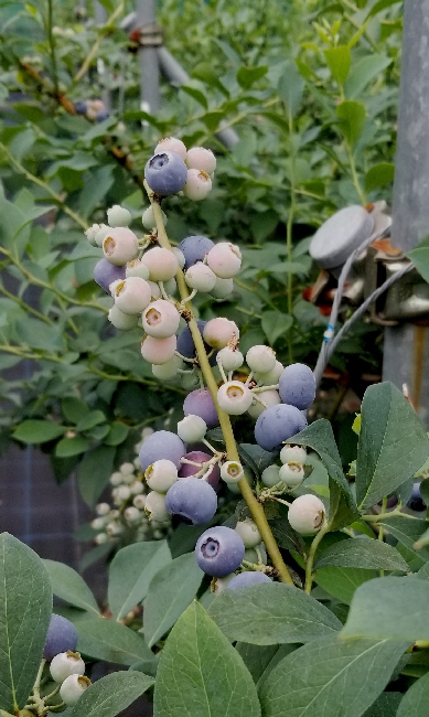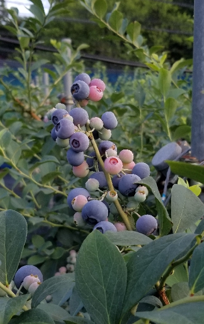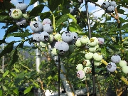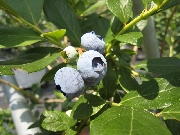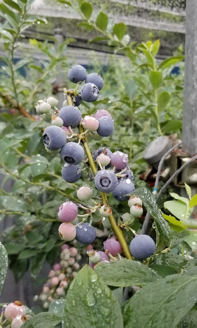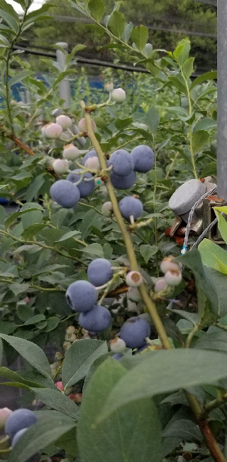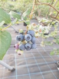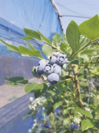 今年のブルーベリーは全て収穫が終わりました。最後の品種は、晩生のパウダーブルーです。名前の通り果実の表面に白い粉(ブルームと言って果実を守る役目があり新鮮な証でもあります)が多く、球形のかわいらしい果実です。