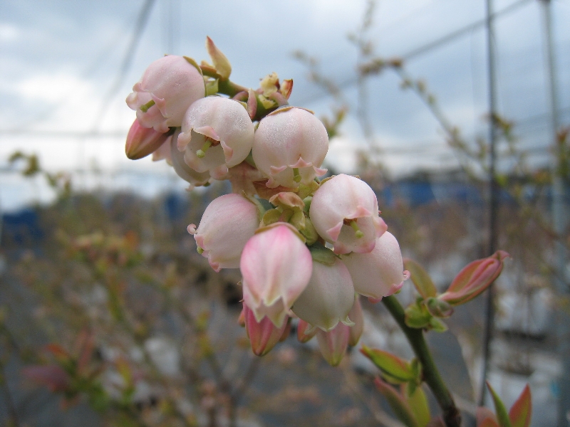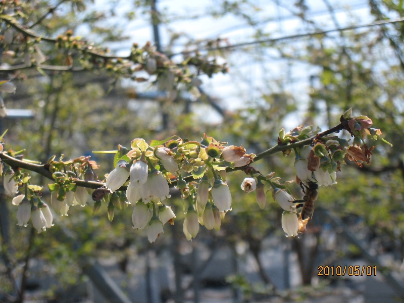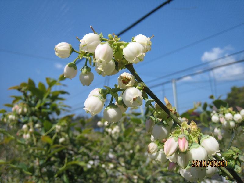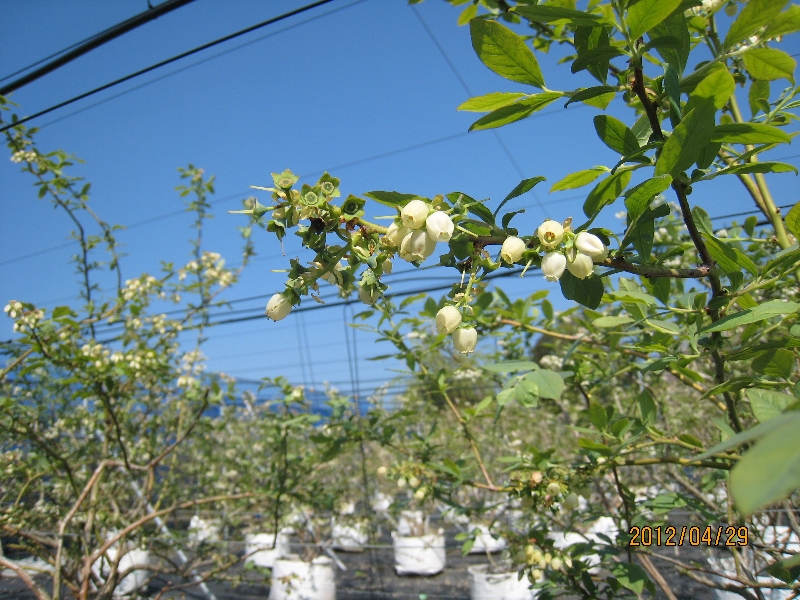 ブルーベリーガーデンはまさに花盛りで、みつばちが忙しく飛び回っています。早生のオニールは満開を過ぎ、中手のデュークやブライトウエルなどは満開になり、晩生のマルは五部咲きの状態です。4月は寒暖の差が大きく雨天が多かったため受粉不良を心配しましたが、少しの受粉不良はあるものの多くは結実しているようなので一安心しています。これからは結実状態を見ながら摘果を行う予定です。